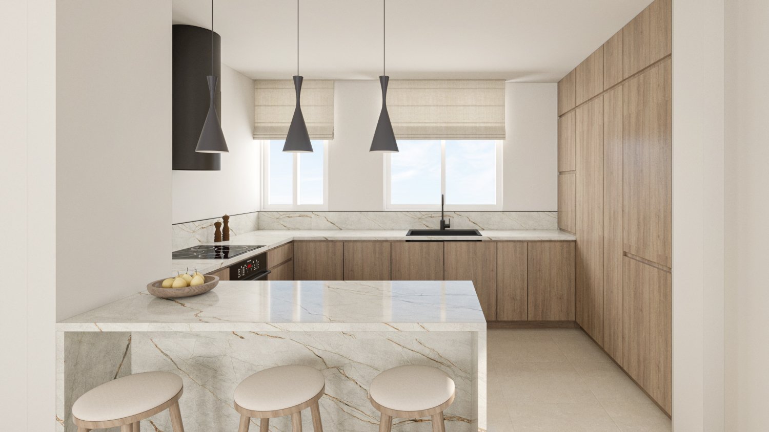 The existing flooring, which mimics beige-toned marble, served as the starting point for the development of a cohesive color palette. Through the use of a tone-on-tone approach in earthy and warm beige hues, emphasis was placed on clean geometries and the formal articulation of the space’s individual elements. Wooden and marble surfaces are strategically introduced into the composition, offering material contrast and visual depth. These textures simultaneously function as subtle dividers, delineating different zones within the apartment’s open-plan layout, without disrupting the overall flow and spatial continuity.